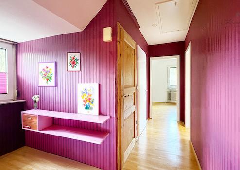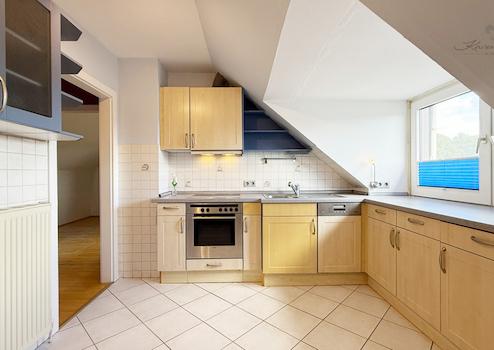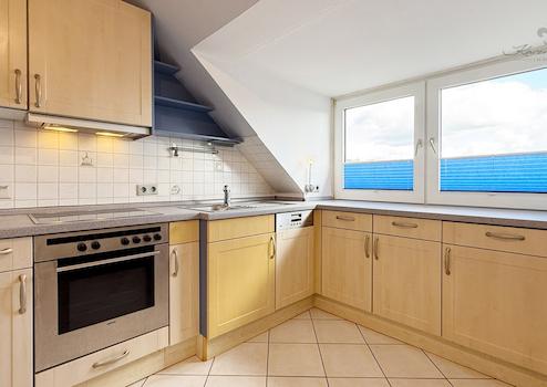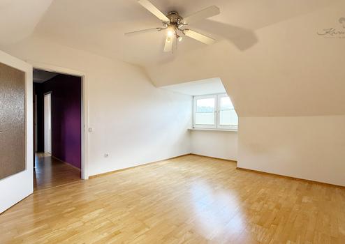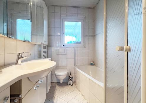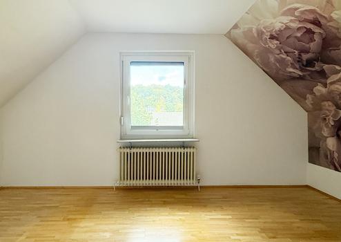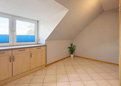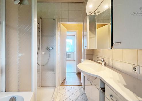 Im Dachgeschoss erwarten Sie zwei weitere lichtdurchflutete Zimmer, ideal als Schlafzimmer, Kinder- oder Arbeitszimmer, ergänzt durch ein zweites Badezimmer mit Dusche und WC – so sind kurze Wege am Morgen garantiert. Im Obergeschoss finden Sie auch die zweite geräumige Küche. Praktisch, um das Erdgeschoss vom Obergeschoss zu trennen und eine weitere Wohneinheit zu schaffen.