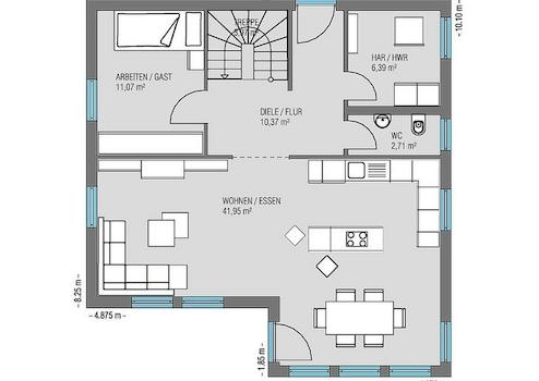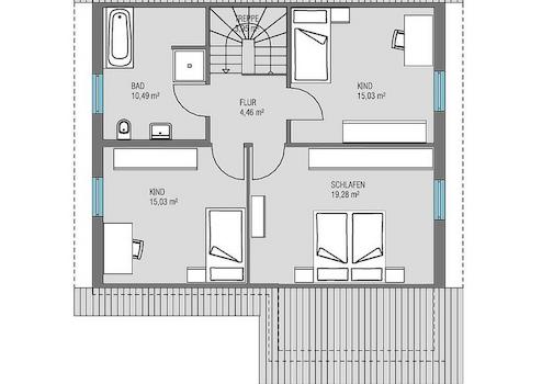 Sinnvoll: Ein zusätzliches Arbeits-/ oder Gästezimmer schafft Planungsfreiheit im Erdgeschoss. Oben gefällt das große Schlafzimmer und zwei mit jeweils ca. 15 m² gleich groß entworfene Kinderzimmer. Da gibt es keinen Streit um das größere Zimmer. Komplettiert wird das Obergeschoss vom richtig dimensionierten Familienbad. Ein Haus für die ganze Familie eben.