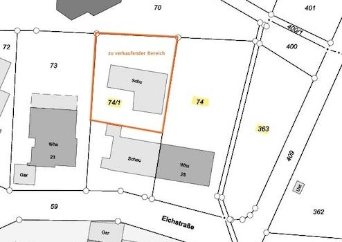 - Grundstück 3: ca. 950 m² (ehemaliges landwirtschaftliches Anwesen auf Flurstücken 74 & 74/1)