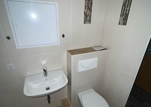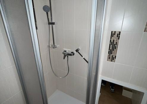 - gefliestes innenliegendes Badezimmer mit Dusche und Handtuchheizkörper