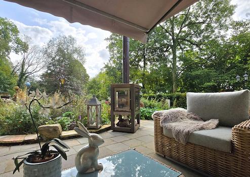 Das massive Gebäude hat eine Fläche von ca. 58 m² und der Holzanbau ca. 25 m². Sehr gut gedämmt und in moderner Ausstattung. Große Glasüberdachung mit mehrere Sitzmöglichkeiten. Das Haus ist komplett mit Pflasterung umgeben, ein kleiner Innenhof mit Natursteinmauer, große Kiesterrasse, Natursteintreppen direkt in den Schönhagener Bach, der das Grundstück in der gesamten Südbreite säumt. 3 Terrassen! Immer der Sonne nach, Gartenkamin, Markise und einen eigenen Jacuzzi.