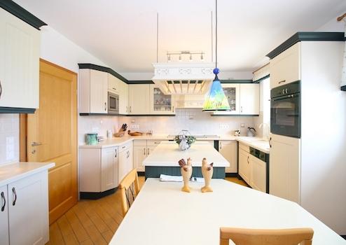 Die voll ausgestattete Küche bietet ausreichend Platz für einen zusätzlichen Essbereich und verfügt praktischerweise über eine anliegende Speisekammer. Zudem befinden sich im Erdgeschoss ein Schlafzimmer, ein Tageslichtduschbad sowie ein Gäste-WC – ideal für ebenerdiges Wohnen!