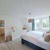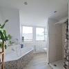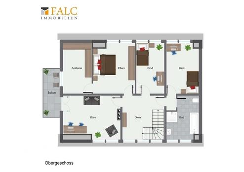 Das Obergeschoss bietet eine großzügige Diele, ein Elternschlafzimmer mit separatem Ankleideraum, zwei Kinderzimmer, ein weiteres großes Büro mit Zugang zum Balkon sowie ein modernes Badezimmer mit Badewanne und Dusche.