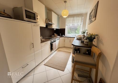 Die separat gelegene Küche ist praktisch gestaltet und bietet ausreichend Platz für alle notwendigen Geräte sowie Stauraum. Von hier aus gelangen Sie zu den restlichen Bereichen der Wohnung.