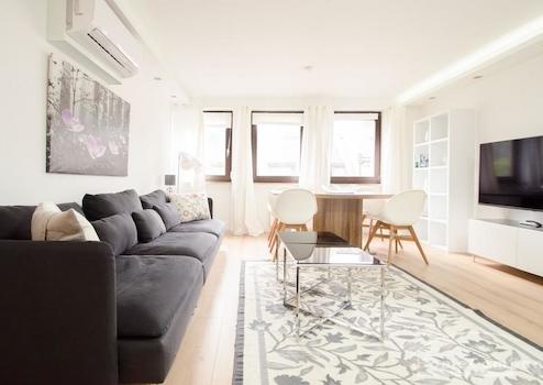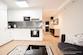 Das helle Wohnzimmer ist mit Sofa, SmartTV und Essplatz möbliert. Die offene Küche ist mit allem ausgestattet, was man täglich benötigt, z.B. Spülmaschine, Mikrowelle und Kaffeemaschine.