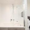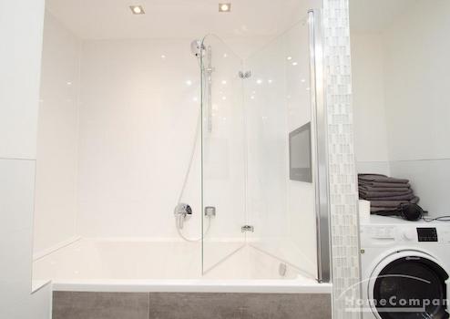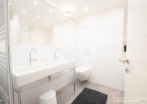 Das moderne Badezimmer verfügt über Doppelwaschbecken, Badewanne mit Duschabtrennung, sowie eine Wasch/Trockenkombination. Separate Toilette vorhanden.