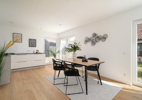 Rund 157 m² Wohnfläche verteilen sich auf drei Ebenen mit sechs Zimmern – großzügig, hell und durchdacht geplant. Der offene Wohn- und Essbereich mit direktem Zugang zur Terrasse bildet das Herzstück des Hauses. Die großen Fensterflächen holen Licht und Natur ins Haus, während die geschlossene Raumstruktur gleichzeitig Rückzug und Ruhe schafft. Hier lebt man modern – ohne auf Gemütlichkeit zu verzichten.
