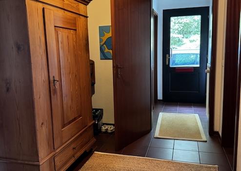 ein moderner Windfang mit Zugang zu einem Gäste-WC mit anschließenden Flurbereich.
