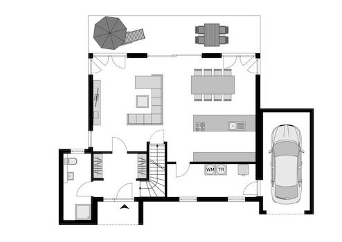 Der Hausentwurf ist gekennzeichnet von einer klassischen Architektur und punktet in der Grundrissgestaltung mit 4 Schlafzimmern und 2 Bädern. Das Erdgeschoss bietet einen Wohn-/Ess- und Kochbereich, der über die Anordnung von 6 Terrassentüren, die an drei Hausseiten verteilt sind, viel Tageslicht in die Raum bringt. Ein zusätzliches Zimmer im EG, das als Schlaf-, Gäste- oder Arbeitszimmer nutzbar ist und ein Duschbad machen auch das Wohnen auf einer Etage, z. B. im Alter oder Krankheitsfall, möglich. Komplettiert wird die Etage durch einen Hauswirtschafts-/Haustechnikraum. Im Obergeschoss befinden sich 3 Schlafräume, einer davon verfügt über einen separaten Ankleidebereich. Ein Familienbad mit Wanne und Dusche sowie ein Flur vervollständigen das Raumangebot im Dachgeschoss.