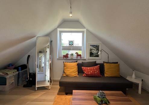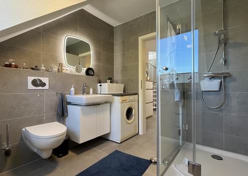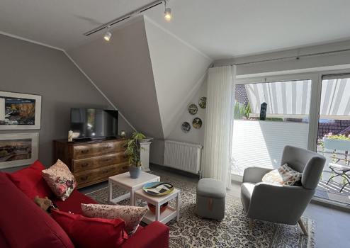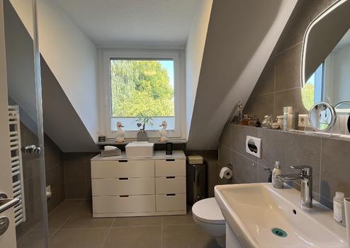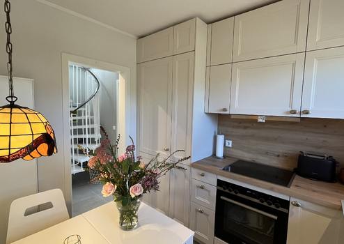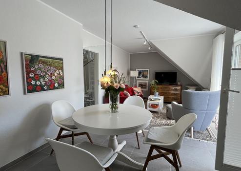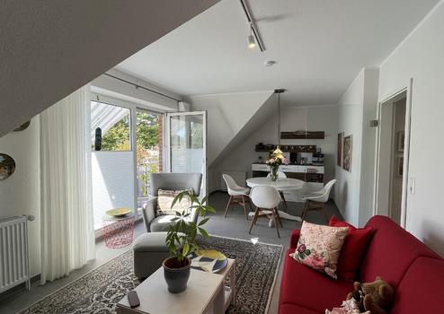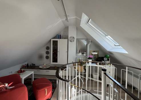 Ihr neues, sonniges Zuhause umfasst eine Wohnfläche von ca. 70 m² und teilt sich wie folgt auf: Über den zentralen Flur gelangen Sie in das Badezimmer mit Fußbodenheizung und ebenerdiger Dusche, das Schlafzimmer, die Küche mit einer hochwertigen Einbauküche aus 2023/2024 und das Herzstück der tollen Wohnung - das lichtdurchflutete Wohn-Esszimmer mit Zugang zum 2018 sanierten Balkon mit neuer elektrischer Markise aus 2024. Hier lassen sich die sonnigen Tage und schönen Sommerabende bei einem Glas Wein genießen. 2024 wurde eine Klimaanlage mit Heizfunktion nachgerüstet. Der Spitzboden, welcher über eine geschwungene, weiß lackierte Wendeltreppe zu erreichen ist, wurde zusätzlich ausgebaut und umfasst eine zu Wohnzwecken ausgebaute Nutzfläche von ca. 15 m² und ist in 2 Schlafzimmern/Büros und einem Abstellraum unterteilt. Dieser Bereich wurde 2023/2024 vollständig renoviert und mit einem neuem Vinylboden ausgestattet. Das Veluxfenster wurde 2018 ausgetauscht. Alle restlichen Fenster in der Wohnung bis auf die Fensterfront zum Balkon wurden 2023/2024 erneuert. Die Sanierungsarbeiten umfassten weiter den Austausch aller Strom- und Rohrleitungen, die Renovierung der Wände, Austausch der Böden durch schöne Natursteinfliesen, den Einbau der neuen Küche im Landhausstil, Nachrüstung elektrischer Jalousien, Insektenschutzgitter, Austausch der Innentüren, Fenster (dreifach verglast) und Heizkörper.