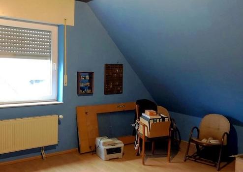 Das Obergeschoss bietet zwei große Schlafzimmer und ein kleineres Zimmer, sowie ein hell gefliestes Vollbad mit Dusche und Badewanne. Eine Holztreppe führt in das wohnlich ausgebaute Dachgeschoss.