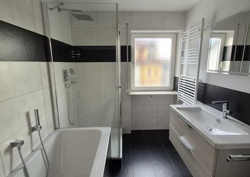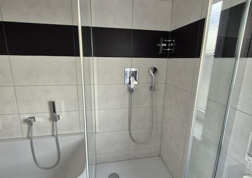 Das Bad verfügt über eine 90x90cm moderne Dusche eine große Badewanne, die genug Platz für zwei Personen anbietet sowie einen Waschmaschinenanschluß.