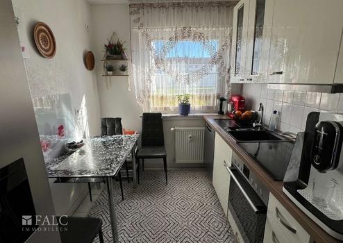 Die Küche ist funktional gestaltet und mit modernen Einbaugeräten ausgestattet. Die hellen Fronten und die durchdachte Anordnung der Arbeitsflächen machen das Kochen zu einem Vergnügen. Ein kleiner Essbereich in der Küche bietet Platz für ein schnelles Frühstück oder einen Snack zwischendurch.