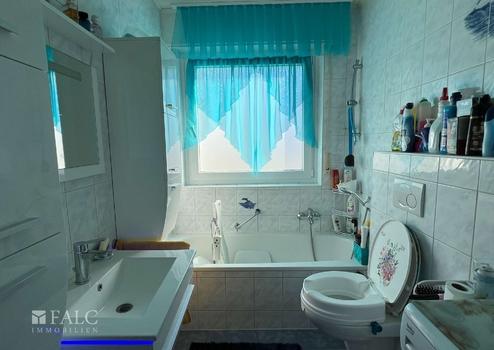 Das Badezimmer ist mit einer Badewanne ausgestattet und bietet alles, was für die tägliche Pflege notwendig ist. Die hellen Fliesen und die funktionale Einrichtung schaffen eine angenehme Atmosphäre.