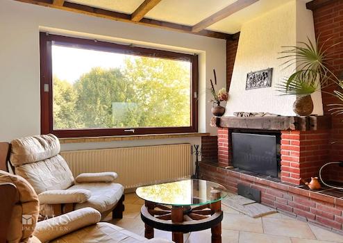 eine angenehme, luftige Atmosphäre, die durch den großen Kamin im Wohnzimmer zusätzlich an Behaglichkeit gewinnt. Von hier aus gelangen Sie auch auf den Balkon,