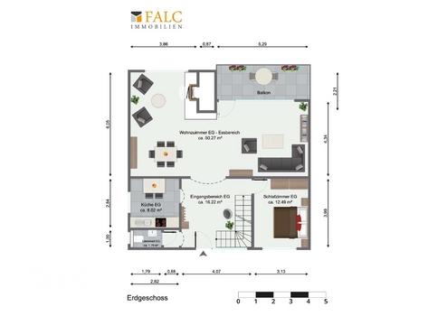 Im Erdgeschoss erwartet Sie ein großzügiger Flur, der Sie in das lichtdurchflutete Wohnzimmer führt. Der offene Schnitt zwischen Wohn- und Essbereich schafft
