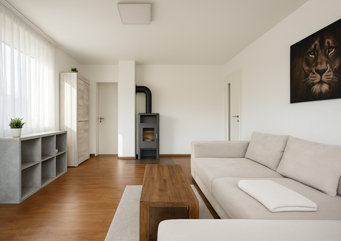 Die Obergeschosswohnung, ebenfalls rund 72 m² groß und 2014 umfassend saniert, zeigt sich modern und einladend. Ein großzügiges Wohnzimmer mit Balkon und Holzofen, eine helle Küche mit zeitgemäßer Einbauküche sowie ein stilvolles Tageslichtbad mit Dusche sorgen für hohen Wohnkomfort. Auch hier stehen ein separates WC, ein eigener Kellerraum und ein PKW-Stellplatz zur Verfügung.
