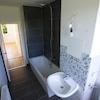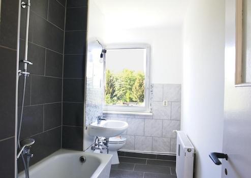 1x Badezimmer mit Badewanne und Fenster