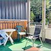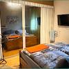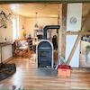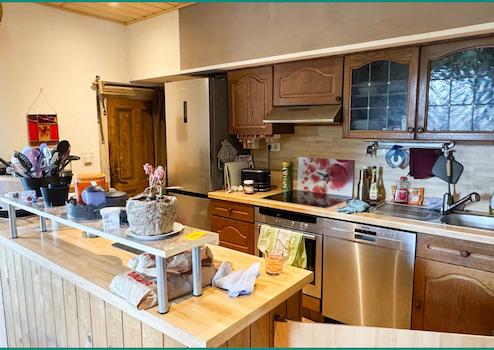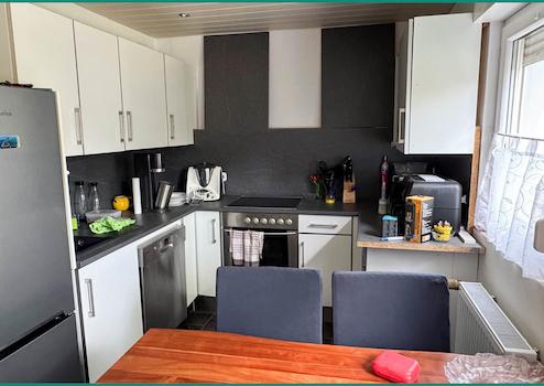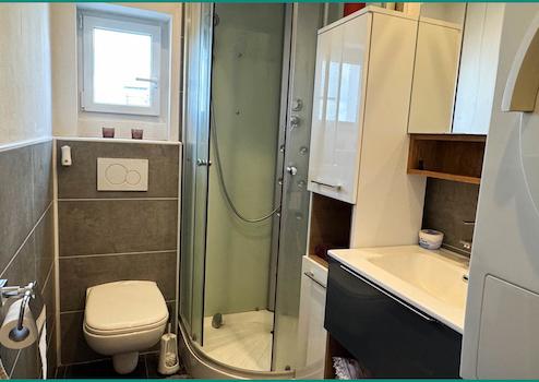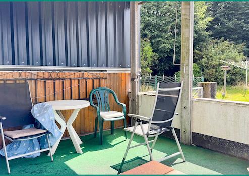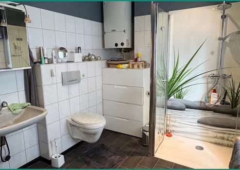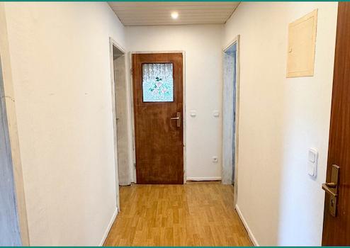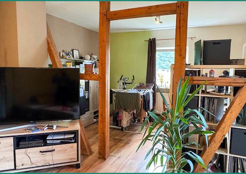 Die Wohnung im Obergeschoss ist renovierungsbedürftig, verfügt aber ebenfalls über ein neuwertiges Badezimmer mit Fenster, Dusche, einer hellen Holzdecke mit LED-Spots, einer hellen Wand- und einer schieferfarbenen Bodenverfliesung. Die Küche ist ebenfalls mit einer schieferfarbenen Fliese ausgelegt und verfügt über neuwertige Fenster. Im Schlafzimmer ist ein halbumlaufender Einbauschrank integriert. Das Wohn- und Esszimmer mit offenem Holzfachwerk bietet viel Platz. Von hier haben Sie eine tolle Aussicht über das hintere Grundstück und Wiesen und Baumbestand. Ein großes Kinderzimmer wird zurzeit als...