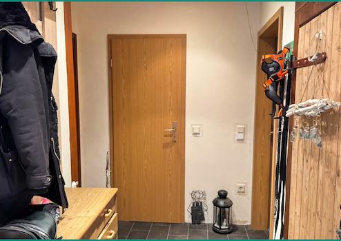 In der Eingangsdiele des Erdgeschosses ist eine schieferfarbene Fliese verlegt. Hier befinden sich u.a. ein praktischer Abstellraum sowie eine Garderobe. Ein offenes Holztreppenhaus führt zum Ober- und bis in das Speichergeschoss. Über eine Verbindungstüre in der Erdgeschosswohnung gelangen Sie in einen großen, offen gestalteten Wohn-, Ess- und Küchenbereich mit naturbehandeltem Fachwerk. Die Böden wurden mit einem Laminat im Buchendekor ausgelegt. Die Decke ist mit einer Holzpaneele und LED-Spots versehen. Das neuwertige Badezimmer verfügt über...