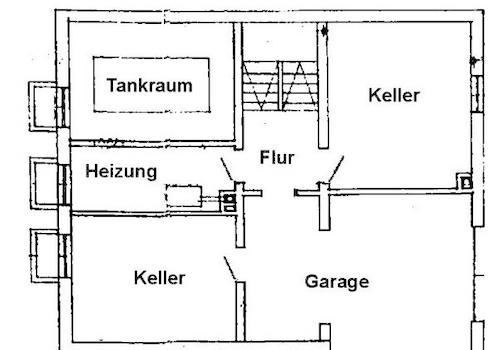Im Kellergeschoss mit Betonestrich befinden sich der Flur, die zwei großen Kellerräume, der Heizraum, der Tankraum sowie die geräumige Garage.