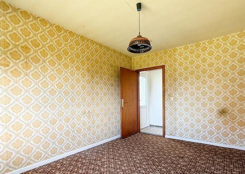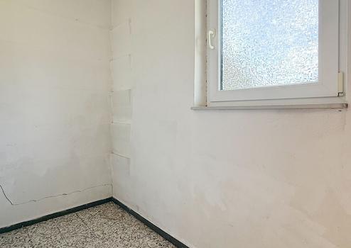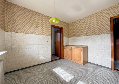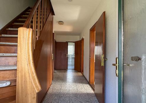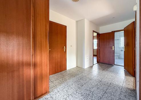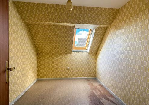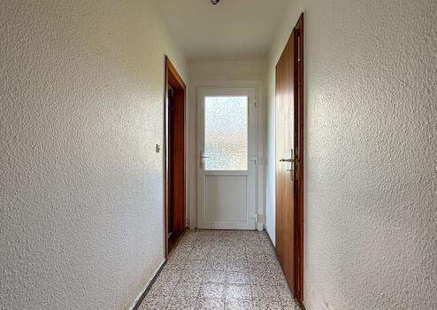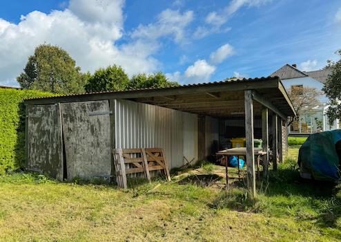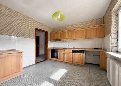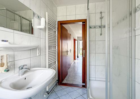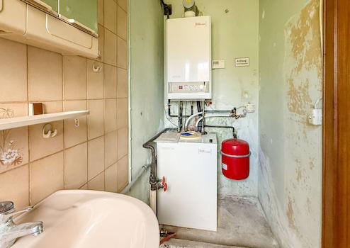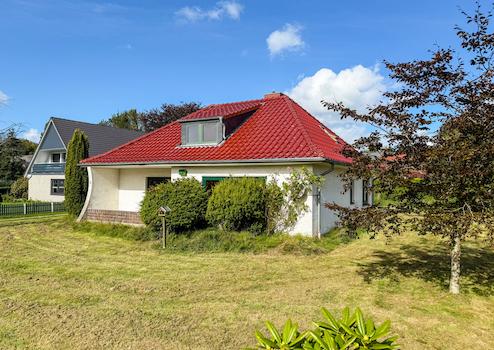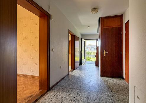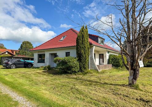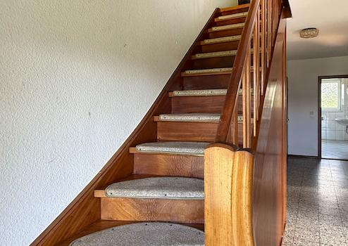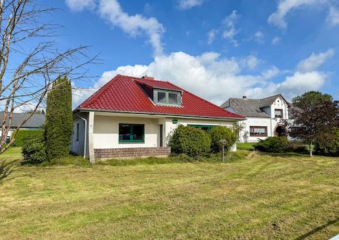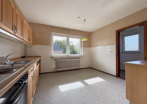 Von der zentralen Diele im EG geht es in die große Küche mit angeschlossener Speisekammer, den Wohnraum mit Zugang zur Terrasse und zum Garten, ein weiteres großes Zimmer sowie in das Duschbad. Eine Tür führt in einen kleinen Hinterflur mit Zugang zu einem zweiten Zimmer, zum Gäste-WC und mit einer Tür nach außen. Über die Treppe in der Diele geht es ins Dachgeschoss. Hier befinden sich 1,5 weitere Zimmer sowie ein kleines Bad mit WC, außerdem eine begehbare Abseite, die als Abstellfläche genutzt werden kann. Ein Keller ist nicht vorhanden. Wärme und Warmwasser kommen von einer Erdgas-Zentralheizung (Baujahr 2001). Im Außenbereich gibt es eine Garage mit Carport und Unterstellmöglichkeiten für z.B. Gartengeräte.