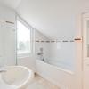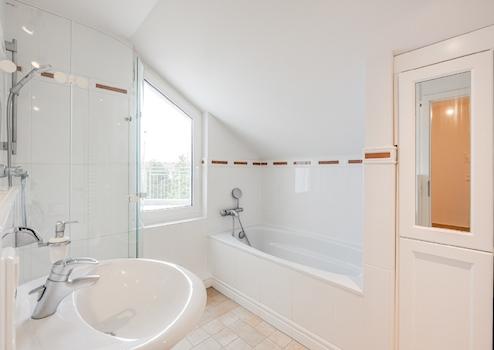 Das gemütliche Schlafzimmer fügt sich harmonisch in die Dachschrägen ein. Durch die vorausschauende Anordnung von Steckdosen und Lichtschaltern ist die Möblierung optimal vorbereitet. Das Badezimmer ist mit Badewanne, Dusche und Waschbecken ausgestattet und präsentiert sich in zeitlosem Design. Ergänzend steht ein separates WC mit eigenem Waschbecken zur Verfügung – praktisch und komfortabel zugleich.