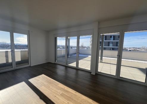 Dank moderner Architektur profitiert die Wohnung mit großer Dachterrasse von Südwestausrichtung und einem optimalen Grundriss. Große Fensteröffnungen bringen den Bewohnern ganztägig Licht und Sonne und sorgen für idealen Wohnkomfort.