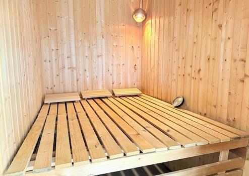 Wohn-/Esszimmer mit Ausgang zur Terrasse, Schlafzimmer, Sauna, Küche mit Einbauküche, Wannenbad, Flur, Abstellraum