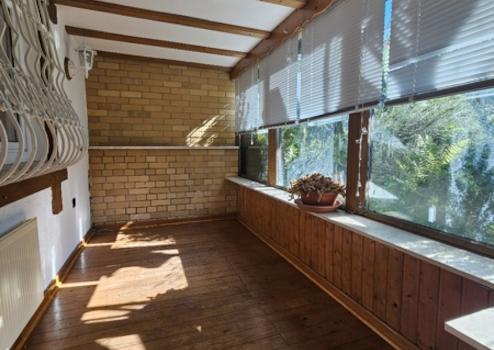 Vom hellen Wohnzimmer aus betreten wir den Balkon, hier lässt es sich herrlich relaxen, der Blick in den Garten und über das Dorf entspannt nach dem Arbeitstag. Der Garten und auch das Haus haben Potenzial, sind aber mit ein bisschen Aufwand und Liebe schnell wieder hergerichtet.