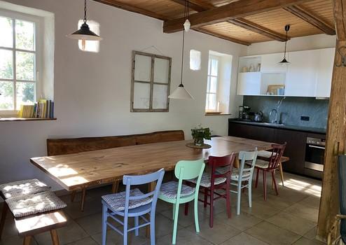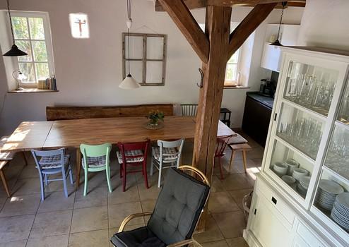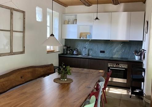 Massivholzboden, Naturstein, Fliesen, Antikholzmöbel, neue Küche mit Naturstein sowie Fußbodenheizung in der Scheune