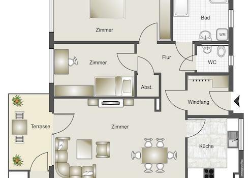 Die Wohnung befindet sich im 1. OG, ist vollständig barrierefrei und besteht aus zwei Schlafzimmern, Wohnzimmer mit Balkon, Küche, Bad sowie einem separaten Gäste WC.