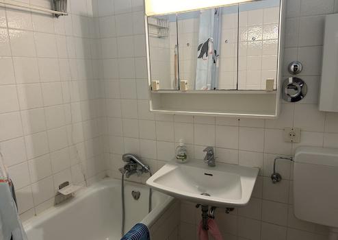 Auf der Rechten Seite finden Sie das hell geflieste Wannenbad.