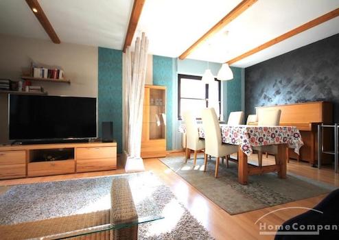 Sehr schöne Wohnung/ Penthouse- Aufstockung auf Bestandsgebäude Ausstattung Wohnen: Wohnzimmer mit Kamin und offener Küche, helles Leder Ecksofa, Flachbildschirm, Couchtisch, Küche: Einbauküche mit kompletter ...