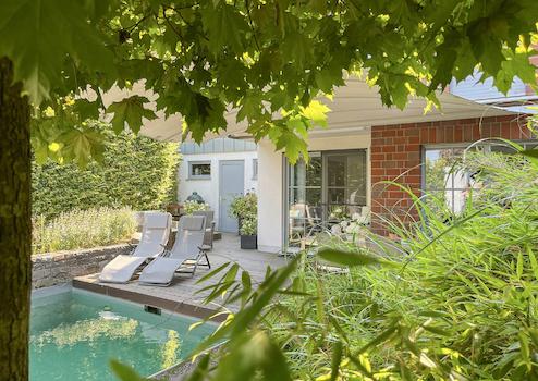 Schwimmteich, Fass-Sauna und die Terrasse mit elektrischem Sonnensegel sorgen für Erholung zu allen Jahreszeiten.