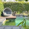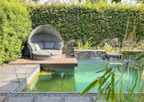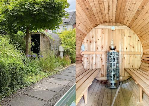 - Schwimmteich und Fass-Sauna