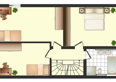 Das Obergeschoss beherbergt drei Schlafräume und ein zeitloses Wannen- und Duschbad.