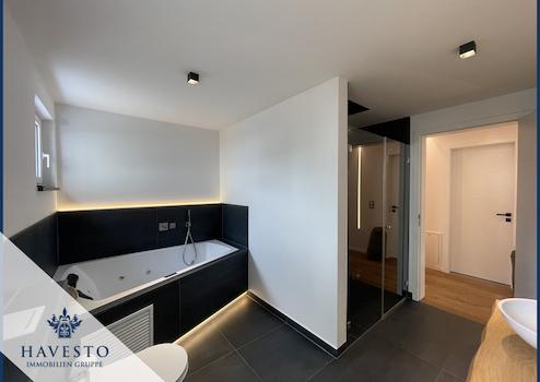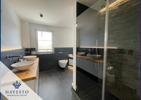 Das Badezimmer ist ein echtes Highlight: Eine bodengleiche Glasdusche mit Natursteinwand aus echtem Schiefer, eine Whirlpool-Badewanne und ein maßgefertigter Waschtisch aus massiver Eiche schaffen eine luxuriöse Wohlfühlatmosphäre. Großformatige Fliesen in harmonischen Farben unterstreichen die zeitlose Eleganz und sind gleichzeitig pflegeleicht und langlebig.