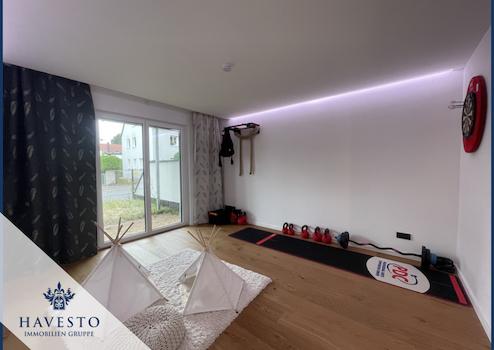 Vom Wohnbereich aus gelangen Sie in ein weiteres, großzügiges Zimmer mit bodentiefen Fenstern und Zugang zum Garten. Aktuell als Hobbyraum genutzt, bietet dieser Bereich vielfältige Nutzungsmöglichkeiten – etwa als Homeoffice oder zusätzliches Schlafzimmer mit Blick ins Grüne.