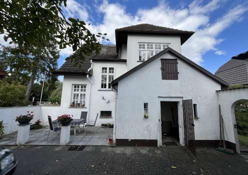 Eine ca. 25 m² große Terrasse mit Blick zum Garten bietet Platz im Freien, und ein großzügiger Garten umgibt das Haus. Die Zentralheizung sorgt im Winter für Wärme, die Fenster sind Doppelfenster aus Holz mit Einfachverglasung. Das Haus ist ausgestattet mit einer Badewanne im Dachgeschoss, sowie einem zweiten Bad mit Dusche im Erdgeschoss, beide Bäder verfügen über Tageslicht. Die Bodenbeläge variieren zwischen Dielen, PVC/Linoleum, Teppich und Fliesen. Zusätzlich stehen drei Garagen, ein Schuppen am Haus, eine Werkstatt, sowie ein uneingeschränkt nutzbarer Keller zur Verfügung. Das Haus wird komplett beräumt übergeben.