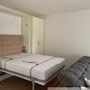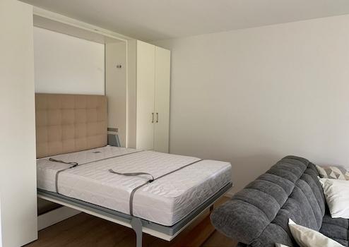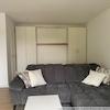 Der großzügige Wohnraum ist durch seinen Zuschnitt in verschiedene Bereiche gegliedert. Sitzecke, Essbereich und Küche gehen offen ineinander über und ein komfortables Doppelbett das sich im Kleiderschrank befindet bildet den Rückzugsbereich.