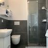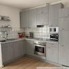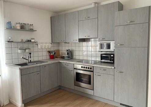 Vinylböden in Wohn-, Schlafzimmer, integrierter Küche und Diele, Fliesenbelag im Duschbad,