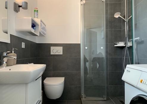 Eine Diele, eine Abstellkammer sowie ein Duschbad mit eigener Waschmaschine vervollständigen die Wohnung