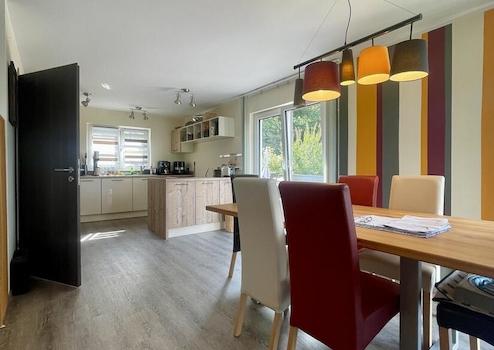 Zur Ausstattung gehören moderne Innentüren, eine zeitgemäße Treppe sowie ein Badezimmer im Dachgeschoss und ein Gäste-WC im Erdgeschoss. Insgesamt präsentiert sich das Haus in einem guten, gepflegten Zustand.
