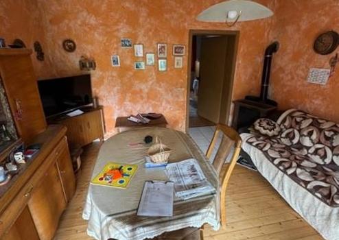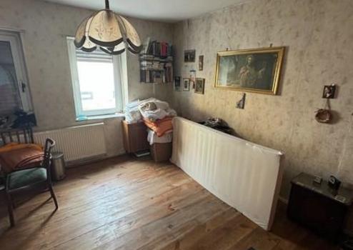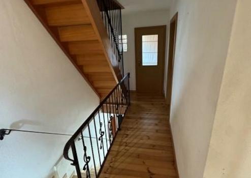 Beim Betreten des Hauses gelangen Sie zunächst in den zentralen Flur. Auf der linken Seite befindet sich ein Schlafzimmer, während sich rechts das Wohnzimmer anschließt. Vom Flur aus führt eine Treppe ins Obergeschoss.