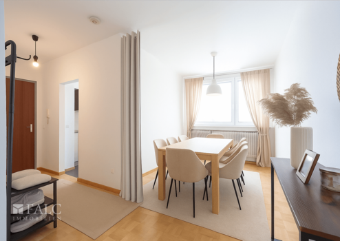 Diese charmante Wohnung im 8. Stock eines Mehrfamilienhauses in Ramersdorf-Perlach kann bequem mit dem Aufzug erreicht werden und bietet dank ihrer erhöhten Lage einen traumhaften Weitblick bis zu den Alpen. Beim Betreten des Eingangsbereichs eröffnet sich die offene Diele, welche in die rund 78 m² große Wohnung einlädt.
