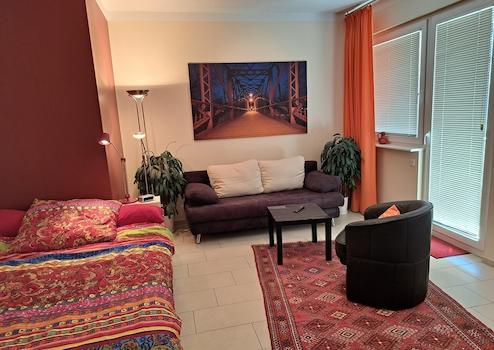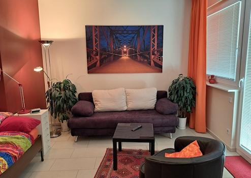 Ruhige und helle 1-Zimmer-Wohnung (35 qm) mit Duschbad, Einbauküche, Flur mit großem Einbauschrank; Süd-Balkon, Aufzug. Das Nichtraucher-Apartment befindet sich in der obersten Etage.