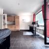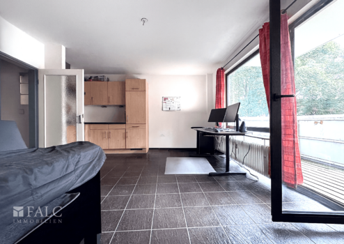Bereits beim Betreten der Wohnung wird die offene Raumgestaltung deutlich: Der Eingangsbereich führt direkt in den einladenden Küchen- und Essbereich, der nahtlos in den großzügigen Wohn- und Schlafbereich übergeht. Durch diese Offenheit entsteht ein angenehmes Raumgefühl, das vielfältige Gestaltungsmöglichkeiten für die Einrichtung bietet.