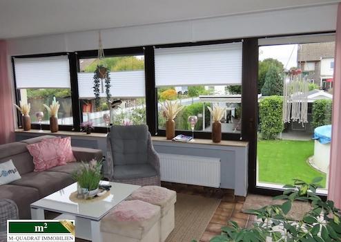 Neben dem Ausgang aus dem Wohnzimmer kann man auch durch den Kellerbereich über eine außenliegende Treppe den äußerst gepflegten Garten erreichen. Hier finden sich neben einer komfortablen Grill-/ Sitzecke, einem Gartenblockhaus, ausreichend Platz für Kinderspielgeräte auch ein Swimmingpool mit einem Fassungsvermögen von etwa 20.000 Litern. Dieser wird mittels einer Sandfilterpumpe gereinigt. Gleichzeitig zirkuliert über ein entsprechendes System vorgeheiztes Wasser, das in einem entsprechenden Behältnis auf dem Dach der Ostseite der Doppelgarage erwärmt wird. Diese (Garage) verfügt im übrigen über ein zur Gartenseite ausgerichtetes zweites Schwenktor, über das bequem Werkzeuge oder andere Utensilien entnommen werden können.