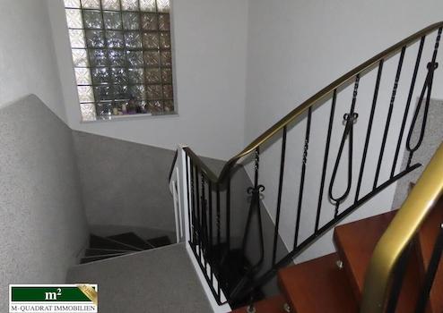 Man betritt das Haus über eine vierstufige Treppe. Hinter der Hauseingangstür liegt ein Windfang, in den eine Garderobe integriert ist. Daran schließt sich das in Steinteppich gehaltene Treppenhaus an, von dem aus jede Wohnung, als auch der zur Straßenseite gelegene Kellerteil begangen werden kann.